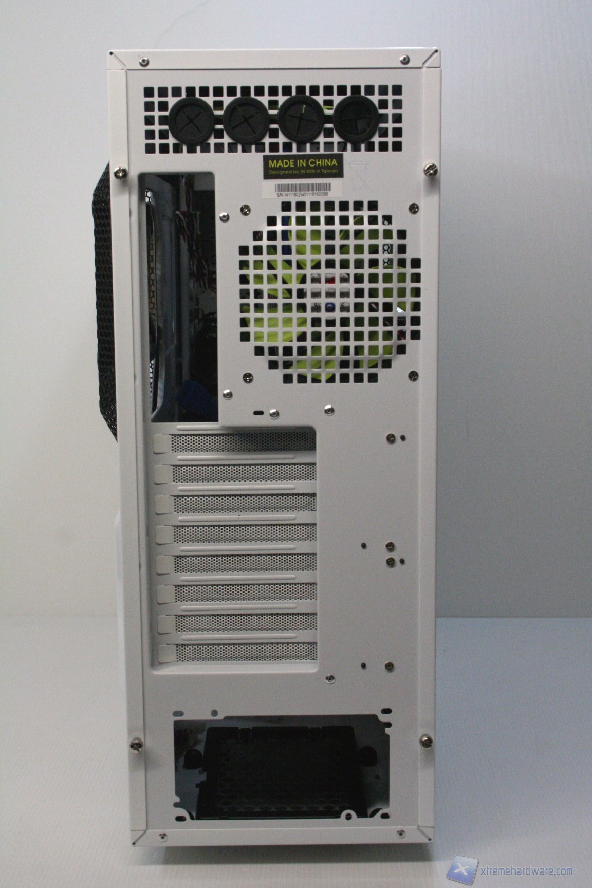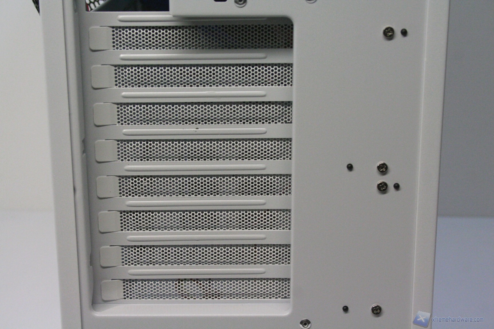 Posteriormente abbiamo una configurazione davvero classica, con una ventola da 120mm e con l’alimentatore nella parte inferiore. Sono presenti 8 slot di espansione PCI che presentano delle piccole aperture d’aerazione; oltre a questo nella parte alta ci sono quattro grandi fessure per l’installazione di tubazioni a liquido ed infine non sono presenti delle aperture laterali per la ventilazione passiva del cabinet, elemento che se vogliamo rappresenta un’occasione mancata in quanto questo spazio si è reso utile ad esempio, in altri modelli della concorrenza, per l’installazione di periferiche verticali o fan controller.