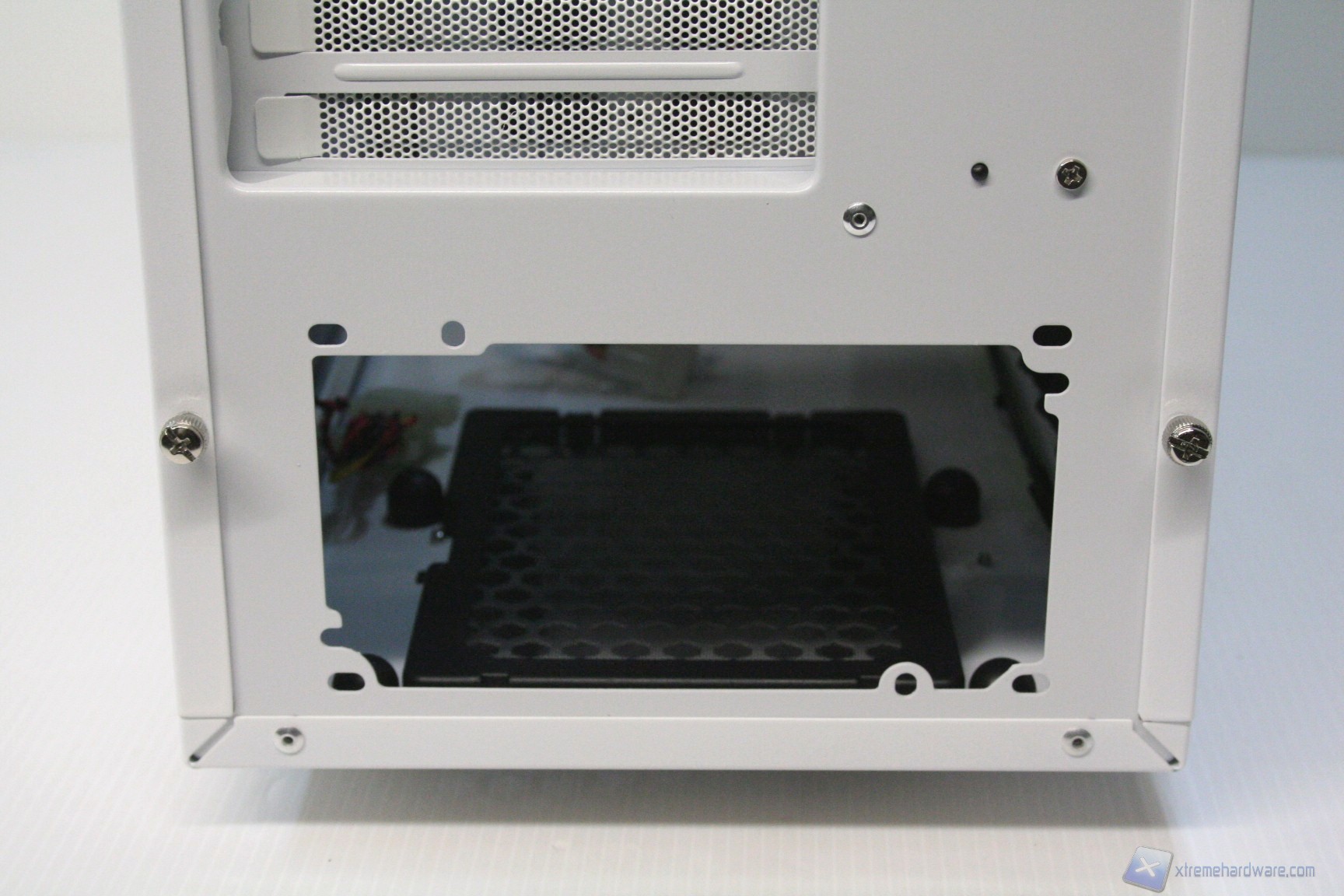 La configurazione è classica anche se sono presenti dei piedistalli che possono essere ruotati. Tali piedini sono in plastica e presentano due gommini antiscivolo preinstallati e circolari. C’è una paratia forata per l’aerazione, con annesso filtro, in prossimità dell’alimentatore e non è possibile installare una seconda ventola frontalmente in immissione. Il filtro dell’alimentatore non è a scorrimento rapido purtroppo, e quindi ciò pregiudicherà in parte la pulizia del cabinet, rendendola più difficoltosa dopo circa un anno di utilizzo. Non possono essere montate rotelle per lo spostamento e la tipologia dei filtri poteva essere migliore, ad esempio sfruttando varianti magnetiche tipo gli ultimi Silverstone.