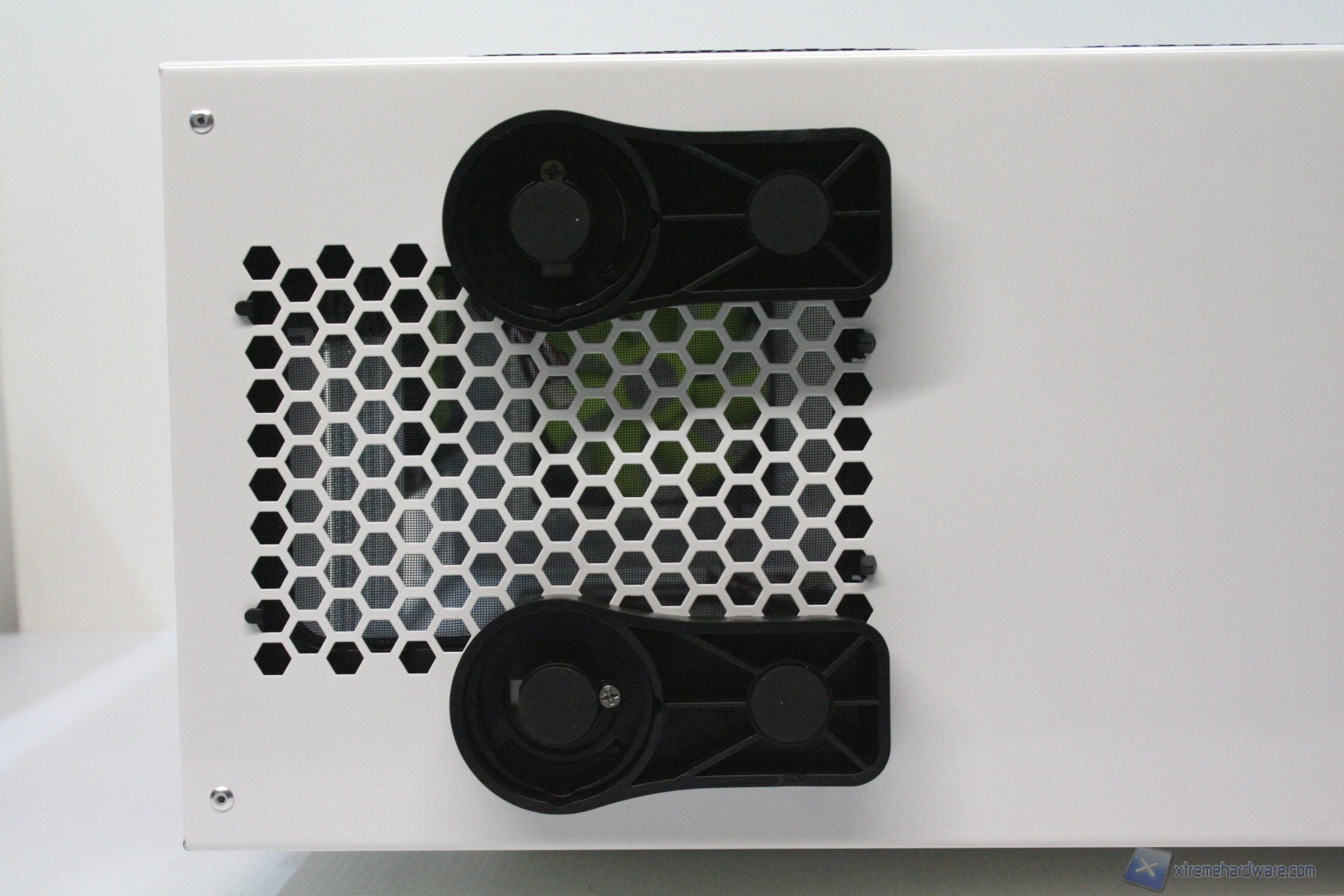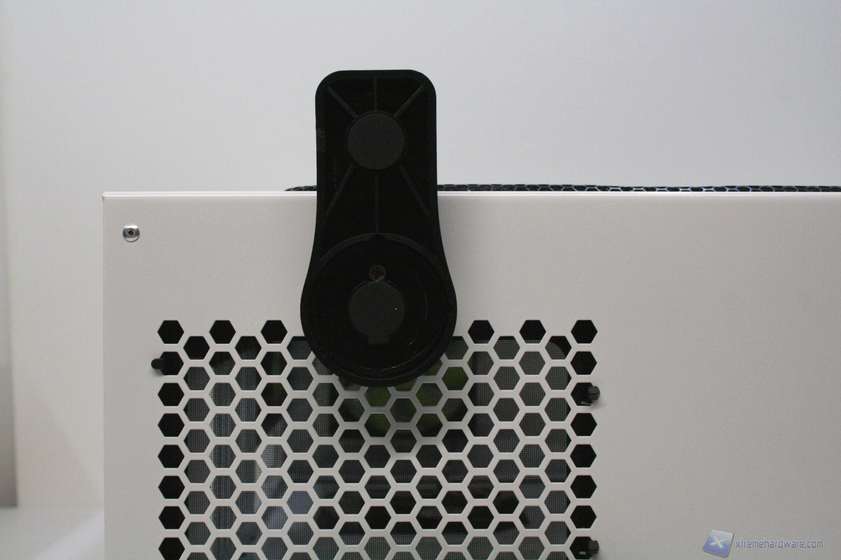 Nella parte superiore troviamo gli ingressi USB (di cui due USB 3.0), il pulsante di accensione, i jack audio e mike in, due ingressi USB 2.0, due connettori eSATA ed un ingresso FireWire. Come si evince dalle foto la finitura del pannello superiore è eccellente, compresa anche la finitura in alluminio spazzolato nella parte interna. Sono presenti anche dei LED di attività. Non è presente nessuna predisposizione per hard disk SATA, purtroppo. Nella parte superiore è presente un sistema con griglie di ventilazione, che permette di migliorare i flussi d’aria in uscita e di rendere compatibile il cabinet anche con radiatori fino a 240mm.