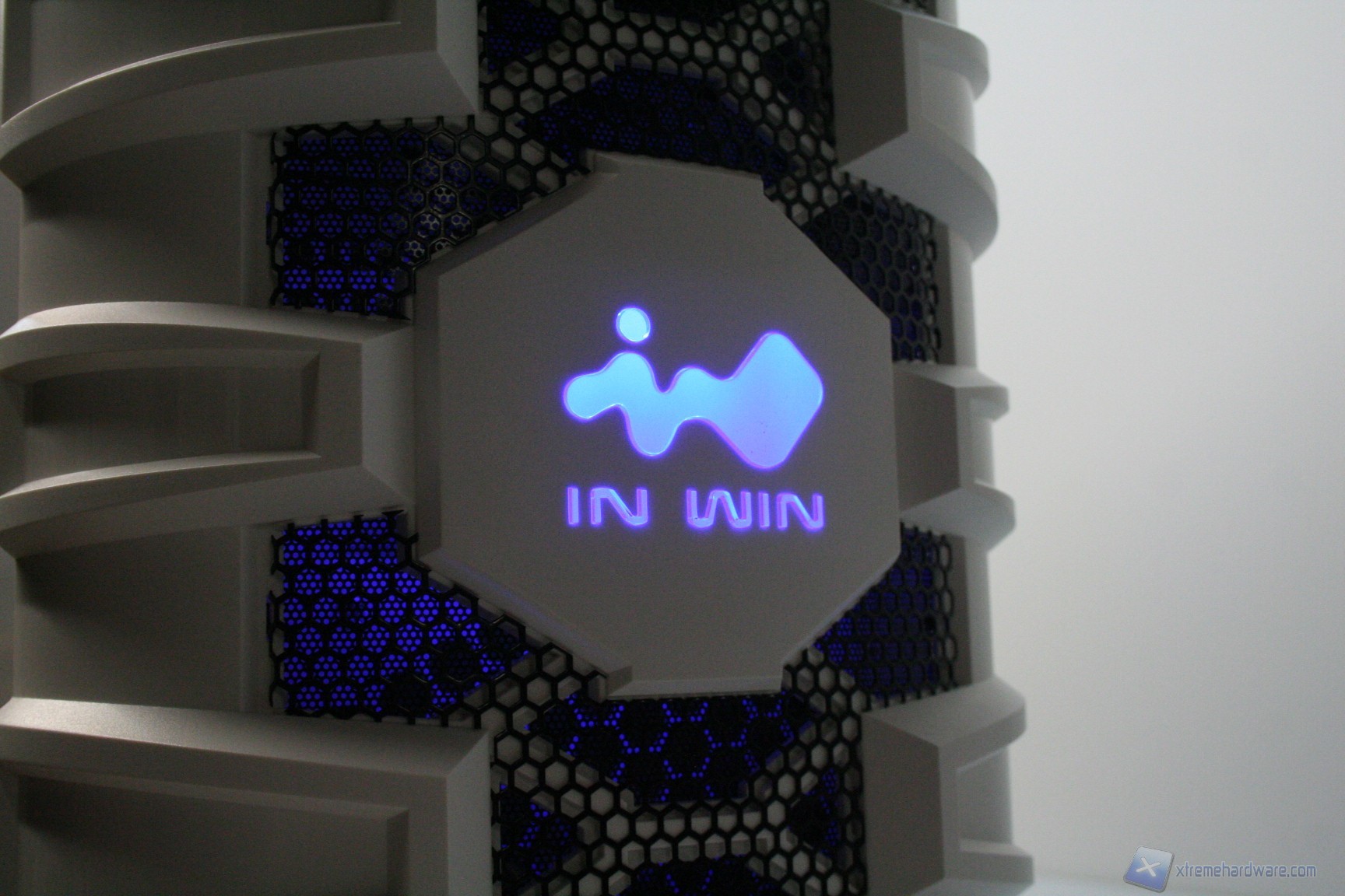 La parte frontale è caratterizzata da una struttura in plastica dura, su sfondo bianco e dettagli in nero, con 6 slot di espansione per periferiche da 5.25’’ accessibili, anche se sarebbe stato possibile integrarne altri, qualora non fosse stata presente la porzione anteriore comprendente il logo InWin, che è dotato anche di un LED di colorazione blu. Nella parte inferiore è preinstallata una ventola da 120mm. La finitura dei frontalini è in mesh e sono presenti, per ogni slot, due ganci laterali che ne permettono un velocissimo rilascio. La tipologia è ottima, robusta e moderna, ed il tutto risulta davvero pratico. I filtri antipolvere sono fissati direttamente sui singoli coprislot, quindi la procedura di pulizia, per quanto rara ed ipotetica, sarà leggermente difficoltosa.