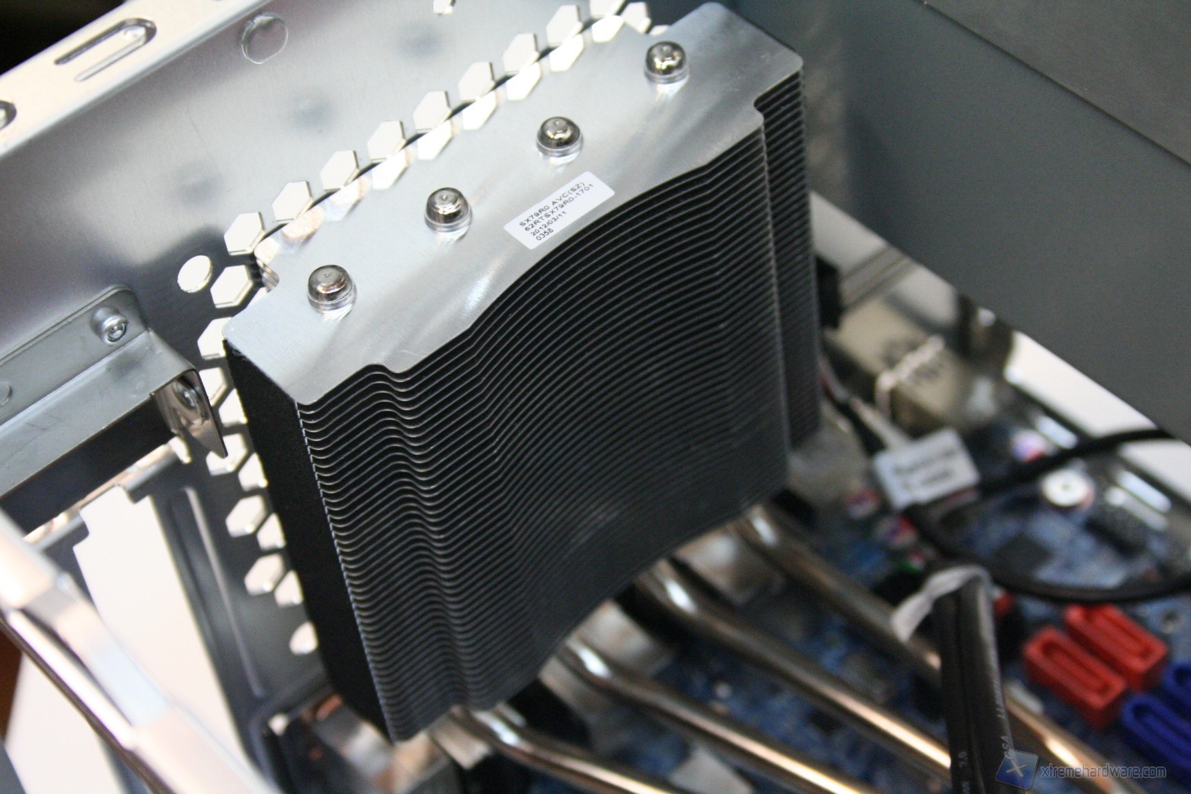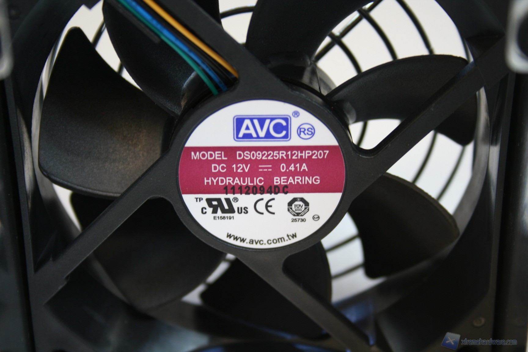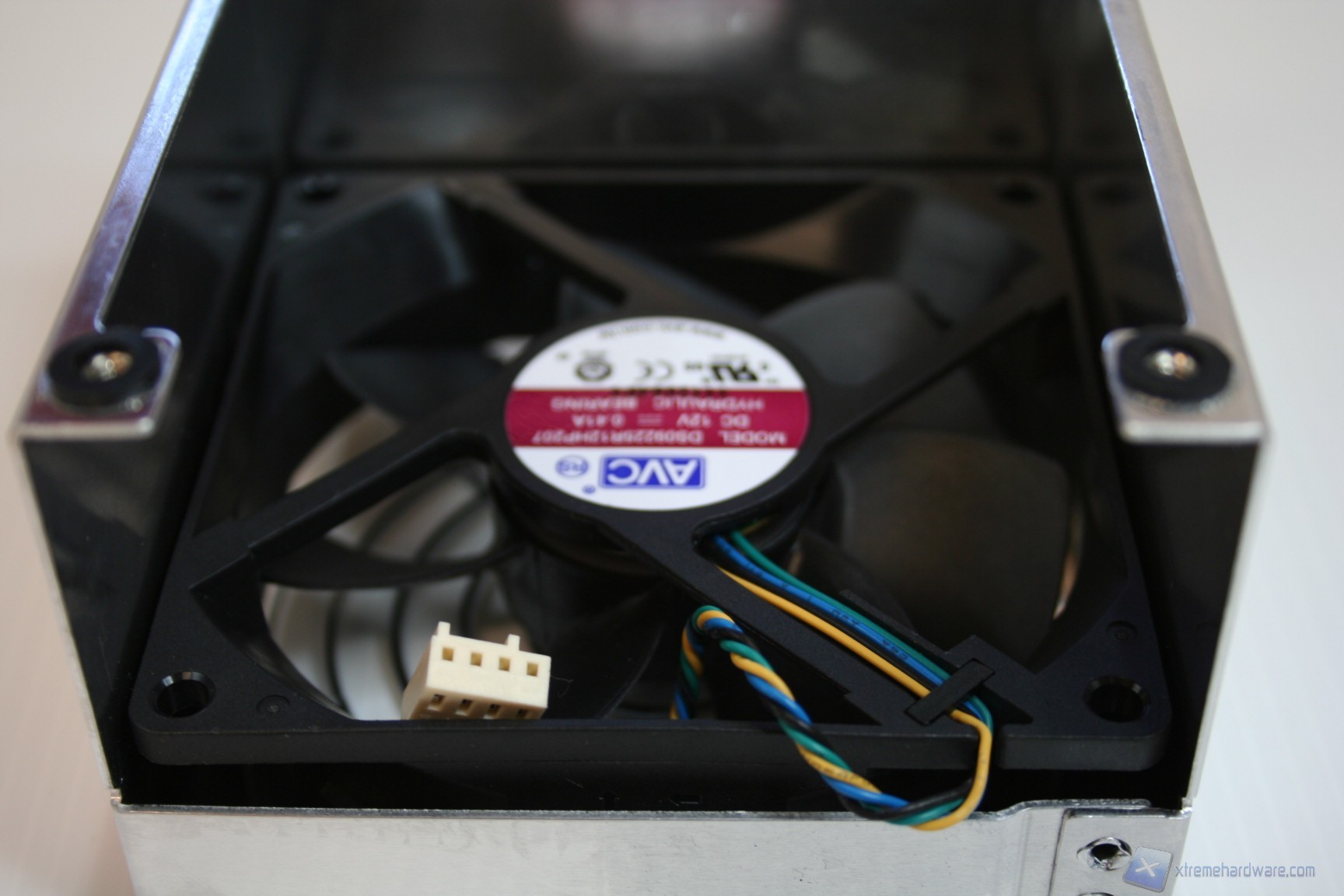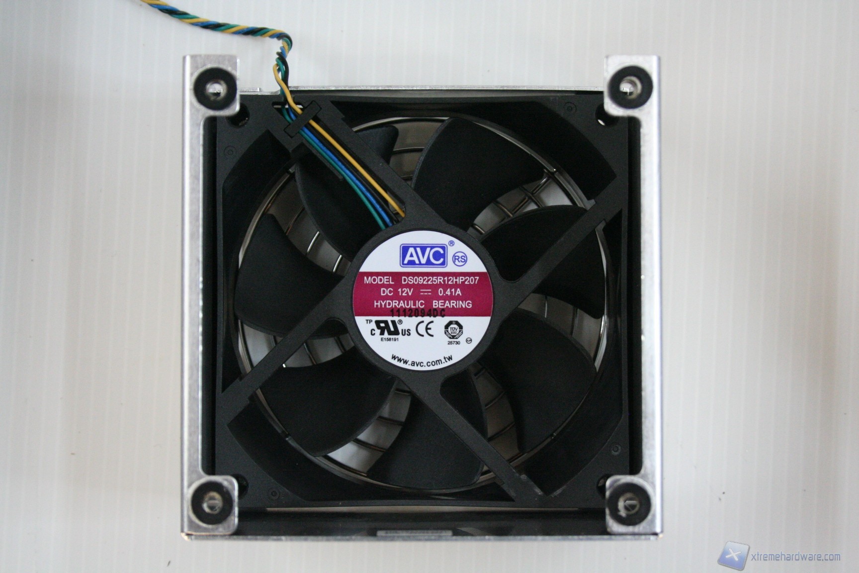 Il sistema di dissipazione per la CPU, che abbiamo già descritto, è di tipo attivo, monta infatti una ventola da 92mm PWM con 7 pale dal design particolare che facilita i flussi d'aria ed allo stesso tempo consente una bassa emissione sonora, perlomeno con temperature inferiori a 60 gradi centigradi. Le specifiche sono al massimo della rotazione: 3200RPM, 50.0CFM e 43dBA. Dopo circa 63 gradi risulterà essere leggermente rumorosa, per via della regolazione PWM preimpostata dal BIOS, per poi aumentare di giri fino ai 43dBA di targa, ma sempre in base alle temperature. Queste ultime comunque rimangono sotto controllo, e data la tipologia di CPU, dissipatore e superficie dissipante dello stesso, si è raggiunto un ottimo risultato. La ventola ha serigrafato il marchio AVC ed è di tipo hydraulic bearing. La sigla è DS0922R12HP207 e presenta un connettore da 4pin, quindi è in grado di essere termo regolata dal BIOS, come abbiamo già mostrato. Il dissipatore I.C.E. di Shuttle è dotato di una base in rame che però non risulta esser stata lucidata a specchio; il corpo invece è in alluminio e da questo dipartono 4 heat-pipes e supporta CPU aventi un TDP massimo di 130W.