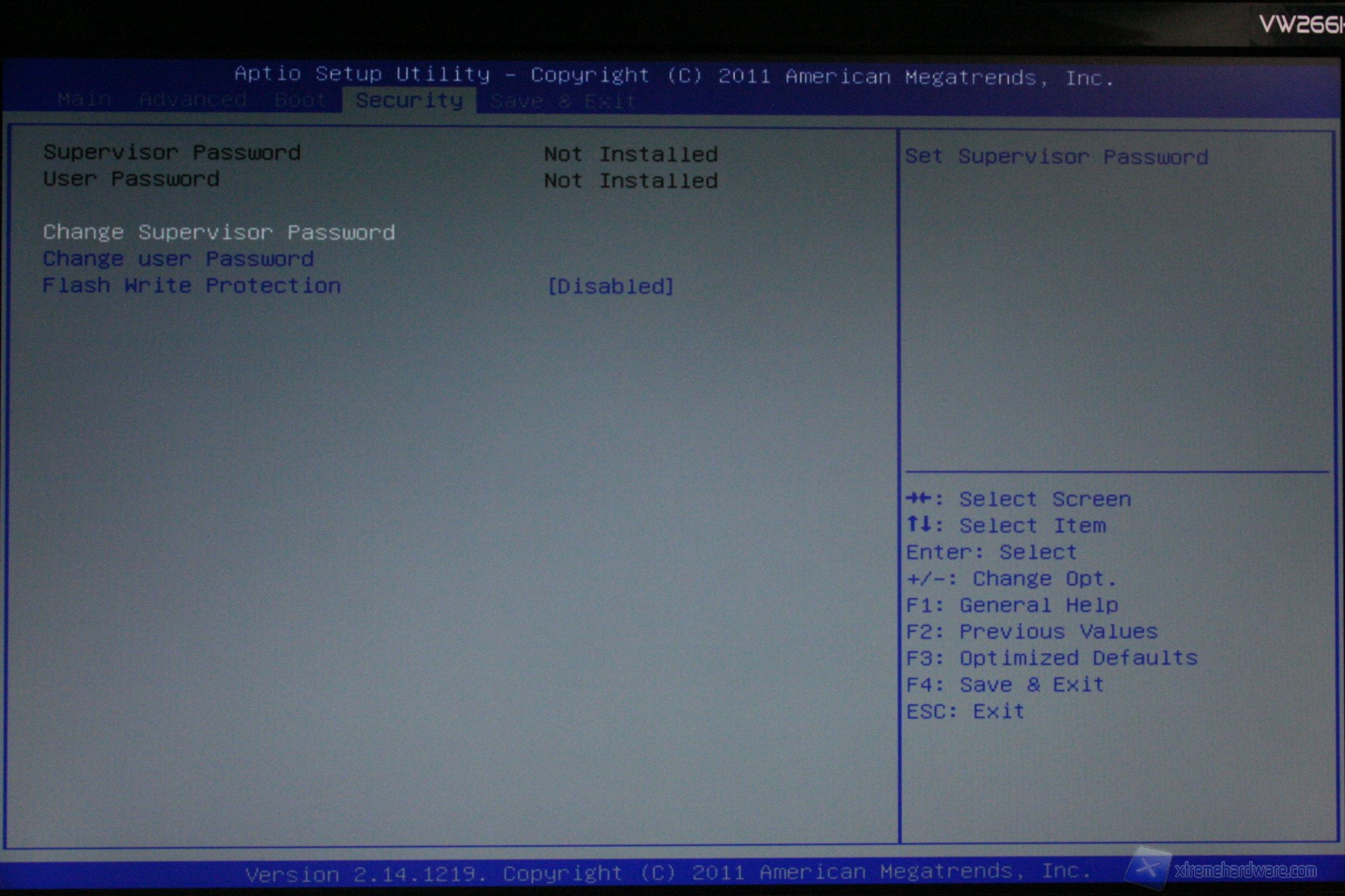 La quarta schermata (Security) ci permette di impostare delle password e protezione del BIOS da scrittura indesiderata.