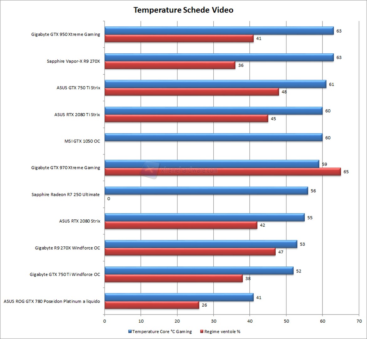 Vi lasciamo due grafici che illustrano meglio ciò che abbiamo detto fino ad ora e che confrontano le varie schede video da noi recensite. Ricordiamo che le ventole sono state impostate su Auto: